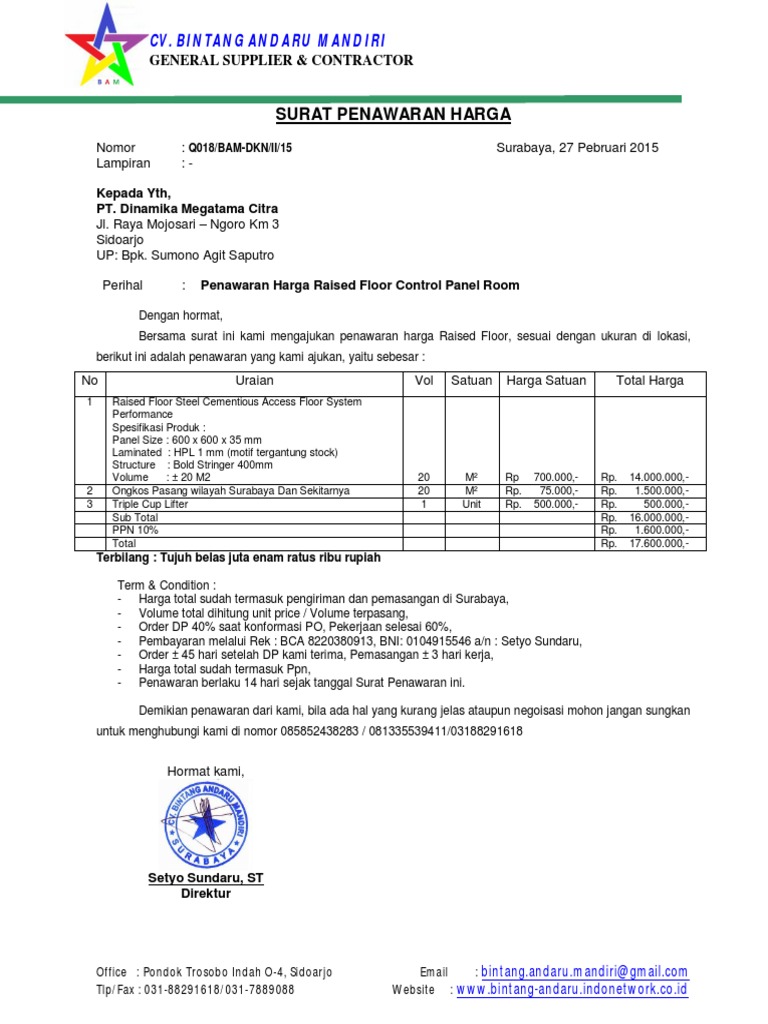 Harga pasang tidak termasuk transportasi. Surat permintaan penawaran adalah surat yang dibuat oleh calon pembeli berisi permintaan penawaran kepada penjual. Contoh surat penawaran untuk desaign interior exterior dan daftar harga no. Harapan saya anda dapat membuat surat penawaran yang menarik. Contoh surat penawaran proyek terbaru dan lengkap file word.