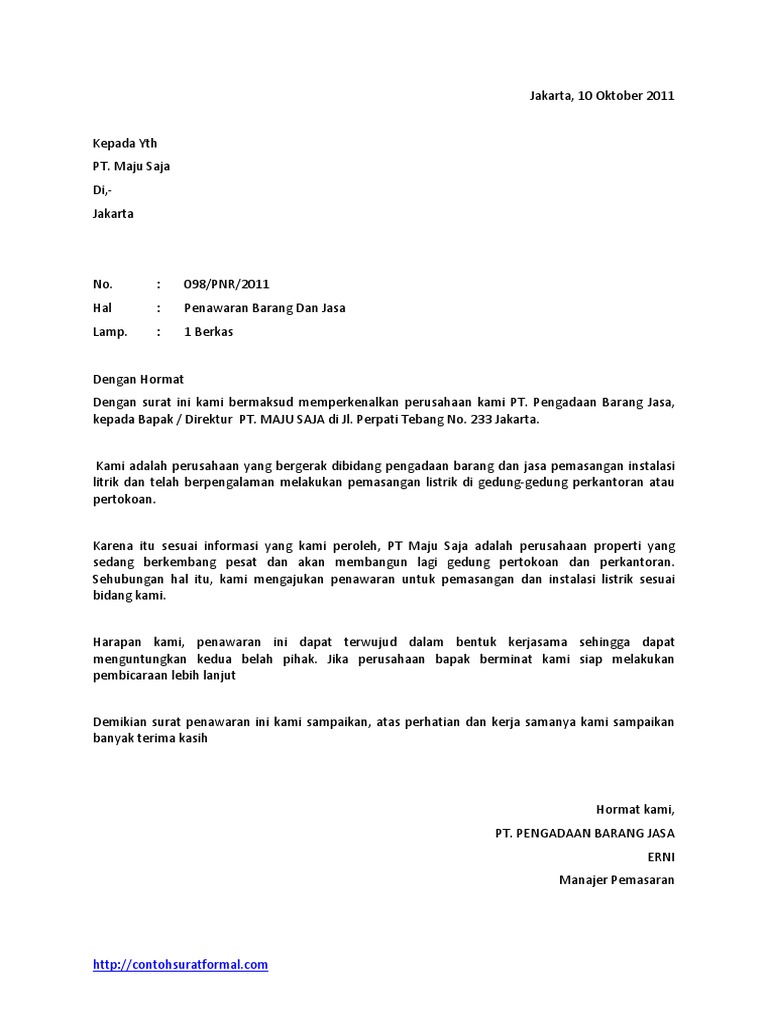 Tujuan dibuat surat penawaran ini. Surat penawaran layanan adalah salah satu jenis surat resmi yang diterbitkan oleh pelaku usaha atau perusahaan yang intinya adalah menawar. Adapun tujuan dari digunakannya surat niaga tersebut adalah untuk memperoleh keuntungan bagi perusahaan dan memajukan perusahaan. Demikian penjelasan lengkap mengenai contoh surat penawaran barang, jasa, serta cara untuk membuatnya. Hal ini memperlihatkan bahwa sebuah perusahaan atau seseorang itu mampu atau bisa membuat sesuatu yang tidak ada pada orang lain, baik itu produk atau pun jasa yang dikuasai. Jaman sekarang, hampir tidak mungkin seseorang bisa hidup tanpa adanya listrik. Surat penawaran jasa serupa dengan surat penawaran barang seperti sudah dijabarkan di awal. Contoh surat penawaran jasa home cleaning. Biasanya surat penawaran ini dibuat oleh para pengusaha atau pebisnis dalam segi ekonomi berupa negosiasi. Kumpulan contoh surat penawaran mulai dari surat penawaran resmi, jasa, barang, kerjasama berserta dengan pengertian dan struktur surat penawaran. Surat diatas merupakan contoh surat penawaran jasa yang dikirimkan oleh pt. Jika iya, sekarang anda membaca artikel yang tepat. Mulai dari surat penawaran kerjasama, barang, produk, jasa contoh surat penawaran banyak sekali, sehingga anda bisa menyesuaikan dengan bidang pekerjaan anda.