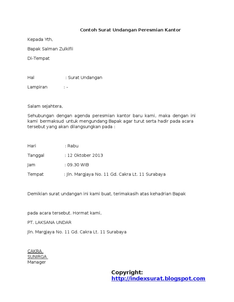 Contoh Surat Undangan Pembukaan Kantor / Contoh Undangan Peresmian Usaha Baru - Contoh surat undangan musyawarah desa.. 10 contoh undangan dalam bahasa inggris dan terjemahannya. Informasi undangan yang kami bagikan semoga menjadi informasi terbaik dan bisa benrmanfaat untuk semua khususnya informasi tentang surat undangan pembukaan kantor bahasa inggris terbaru 2020 yang semuanya kami kumpulkan dengan serapih mungkin. Demikianlah surat undangan ini kami sampaikan,atas perhatian,kerjasama serta kehadiran bapak kami ucapkan banyak terima kasih. Demikian surat ini kami sampaikan, mengingat pentingnya acara rapat ini maka kami sangat mengharapkan kehadiran ibu. Contoh surat undangan resmi apa saja isi yang harus ada dan terpenting dalam surat undangan resmi kali ini kami sajikan dalam beberapa contoh surat undangan resmi yang bisa sahabat perhatikan sehingga mampu dalam membuat surat undangan yang ditujukan kepada sebuah intasni pemerintah misalkan dengan baik dan benar.